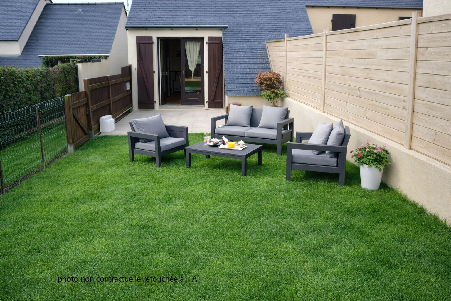 Uniquement chez nous ! Maison comprenant une pièce de vie ouverte sur cuisine, coin salon avec possibilité de couchage 2 personnes , wc, salle de bains, à l'étage grande chambre en mezzanine Location possible pour 4 couchages, cellier,terrasse avec joli jardin parking !